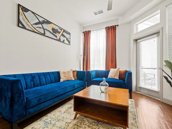 This entire apartment with 1 bedroom and 1 bathroom can accommodate 4 people. Queen-size bed in the bedroom. Living room has a sofa that becomes a futon and/or a queen size air mattress can also be used.